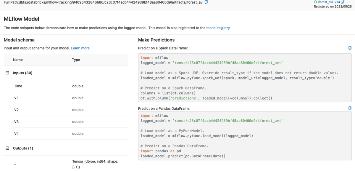 MLflow generates code for creating and registering the Apache Spark UDF for model  inference