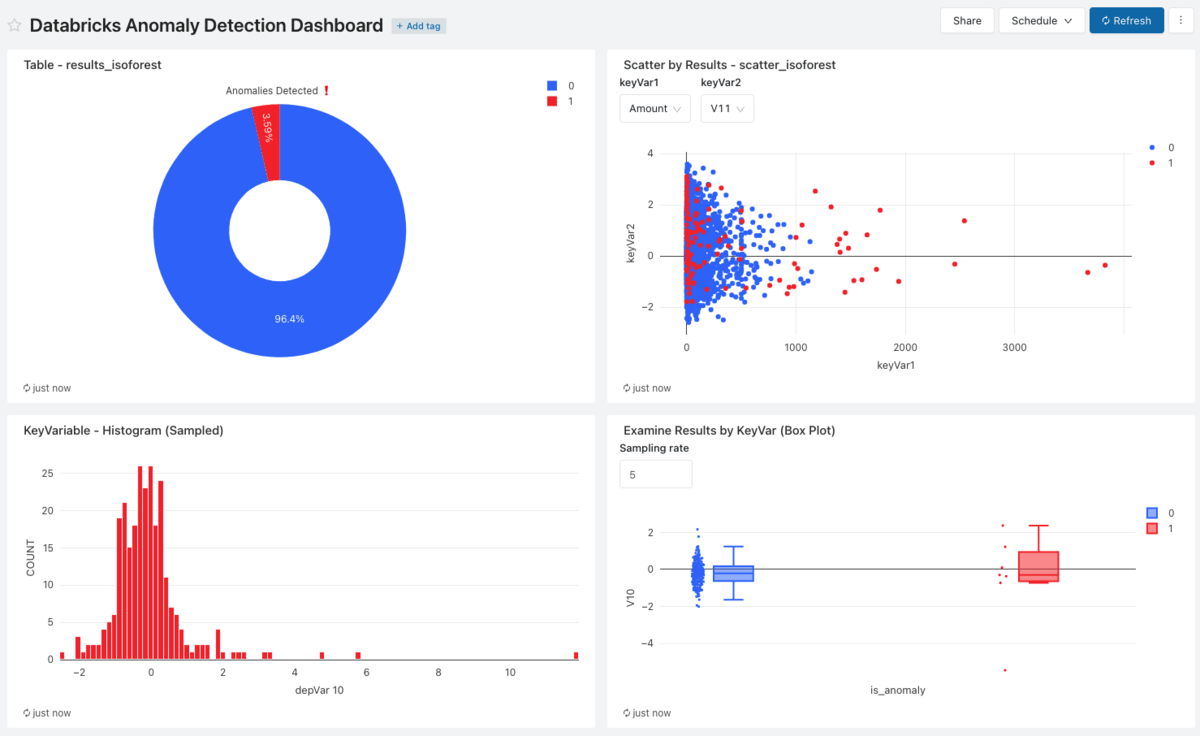 이 파이프라인이 실행되는 동안, 데이터브릭스 SQL을 사용하여 식별된 비정상 레코드를 시각화할 수 있으며, 데이터브릭스 SQL 대시보드의 새로고침 기능을 통해 지속적으로 업데이트할 수 있습니다. '예측' 테이블에 대해 실행된 쿼리를 기반으로 시각화된 대시보드를 아래에서 확인할 수 있습니다.