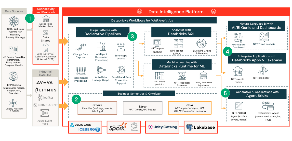 Databricks 데이터 인텔리전스 플랫폼을 기반으로 구축된 이 솔루션은 여러 소스의 원시 운영 데이터를 자연어 대화를 통해 실행 가능한 인사이트로 변환합니다. 이 솔루션은 OSDU 시추공 로그, 리그 IoT 스트림 및 ERP 유지보수/재무 기록을 단일의 거버넌스된 레이크하우스로 통합하여 시추, 지하, 재무 등 모든 팀이 동일한 진실 공급원을 기반으로 작업할 수 있도록 합니다.