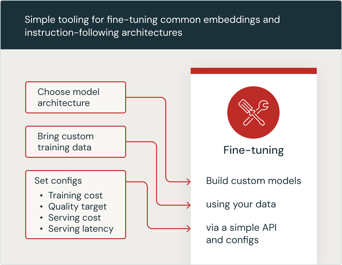 Fine-tuning adapts an existing general-purpose LLM model by doing additional training using your organization’s IP with your data. Databricks fine-tuning lets you do this easily by allowing you to start with your preferred LLM model — including curated models by Databricks such as MPT-30B, Llama 2 and BGE — and giving you the ability to do further training on new datasets.
