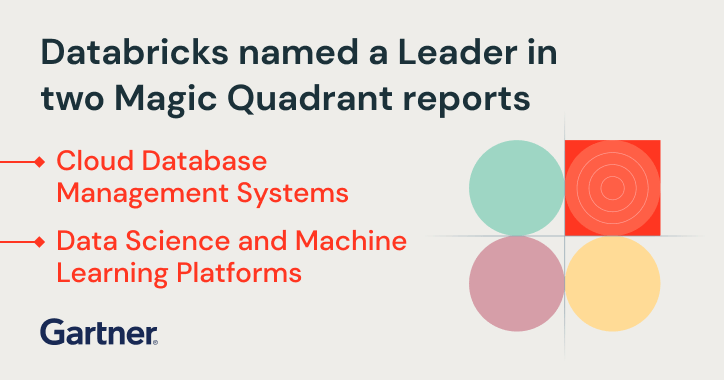 Databricks is proud to announce that Gartner has named us a Leader in both the 2021 Magic Quadrant for Cloud Database Management Systems and the 2021 Magic Quadrant for Data Science and Machine Learning Platforms.